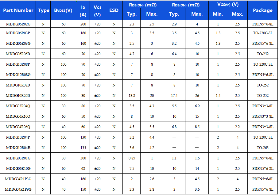 除此之外,MDD新推出的低压大电流系列MOS针对不同的应用场景,推出不同的型号,以满足各行业匹配需求。